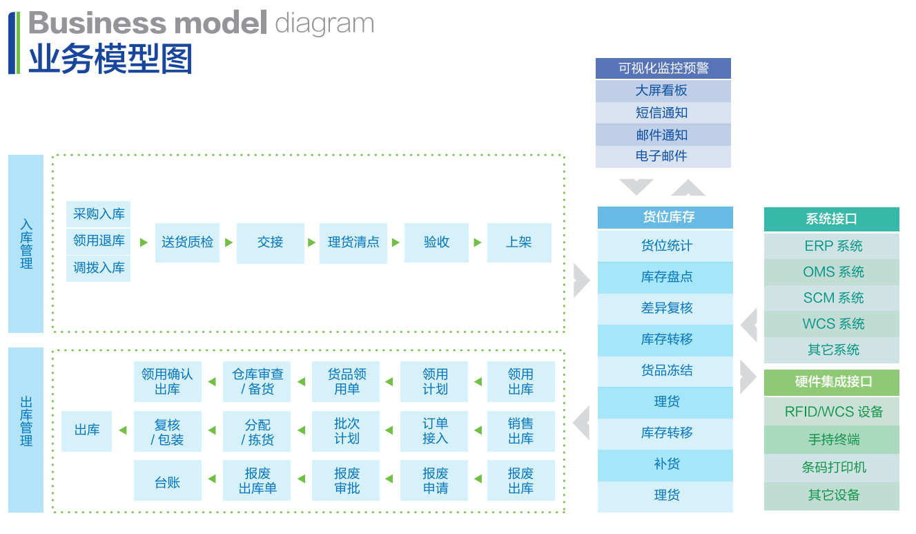 通過對(duì)入庫(kù)業(yè)務(wù)、出庫(kù)業(yè)務(wù)、調(diào)拔業(yè)務(wù)的管控,可以實(shí)現(xiàn)貨品批次管理、物料對(duì)應(yīng).庫(kù)存盤點(diǎn)、質(zhì)檢控制等需求。并且對(duì)貨品全流程監(jiān)控,提高倉(cāng)庫(kù)作業(yè)效率,降低企業(yè)成本,全面提升企業(yè)倉(cāng)庫(kù)管理的綜合能力。